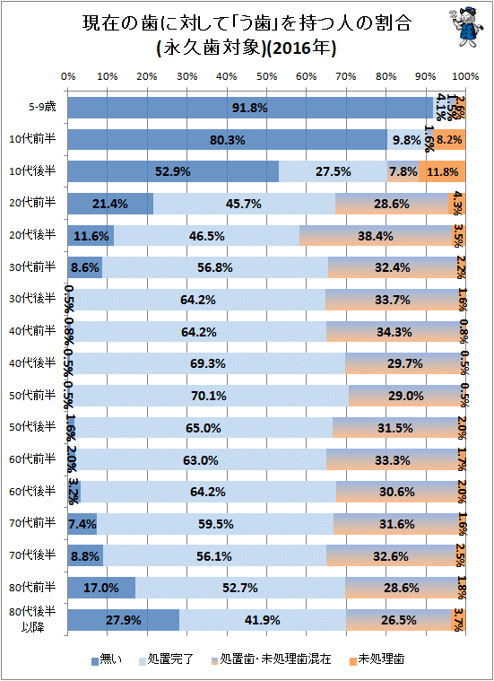 なんと年齢を重ねるにつれて虫歯がない、なったことのない割合が大幅に減少しています・・・。