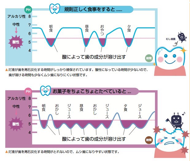 ダラダラ食事をしたり、不規則におやつを摂ったりするとお口の中がずっと酸性状態になり、ムシ歯になりやすくなります。